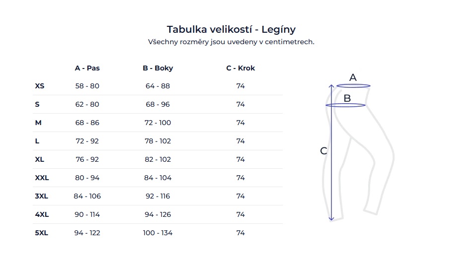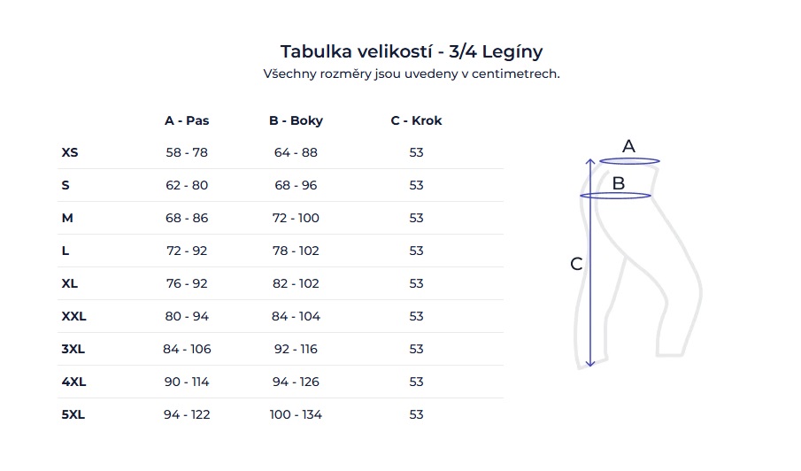 Pro 3/4 legíny (skvělé na jaro/léto, kolo, indoor) platí níže uvedené rozměry.
