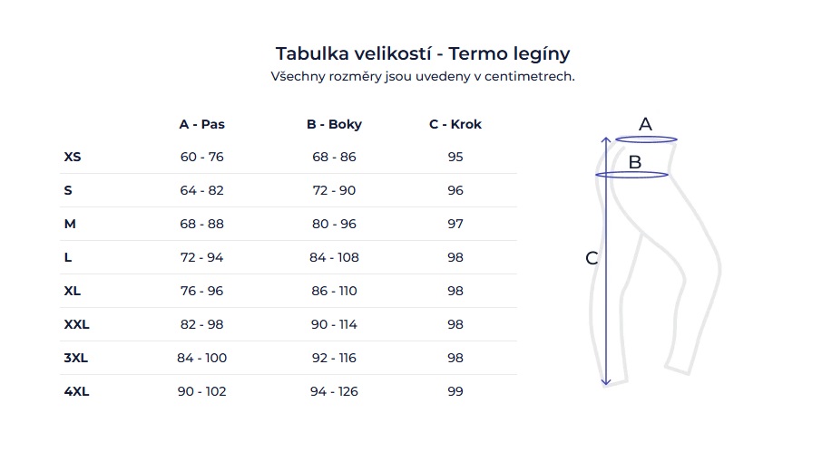 Termo legíny (kategorie) mají zateplený funkční materiál a často se nosí i jako „druhá kůže“ do chladna. U této kategorie doporučujeme řídit se hlavně tabulkou přímo u konkrétního produktu – některé kolekce mohou sedět o trochu jinak.