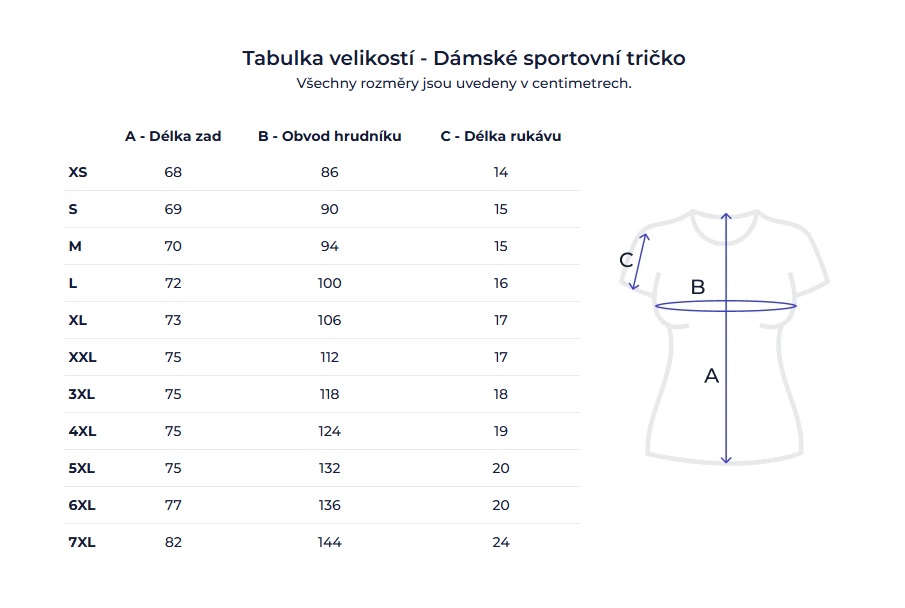Dámská sportovní trička A = délka zad • B = obvod hrudníku • C = délka rukávu
