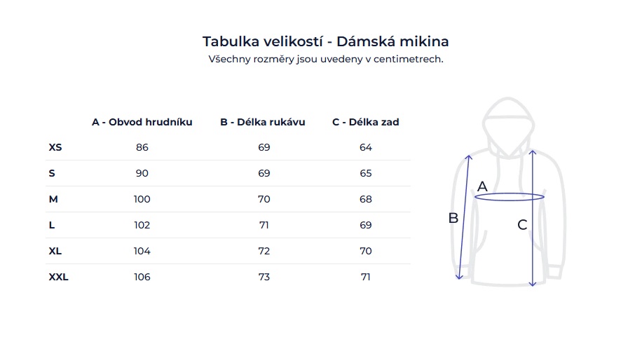 Dámské mikiny A = obvod hrudníku • B = délka rukávu • C = délka zad