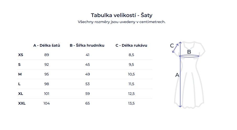 Šaty A = délka šatů • B = šířka hrudníku • C = délka rukávu