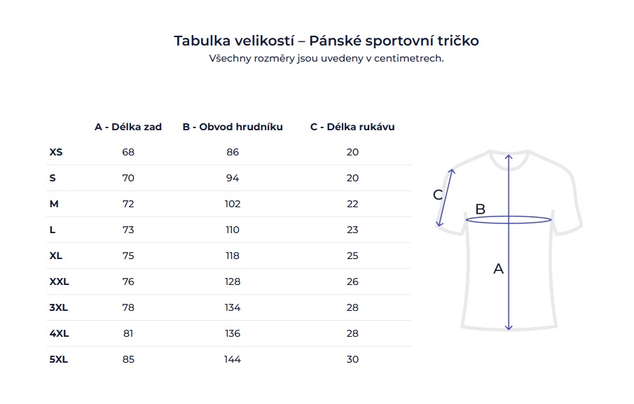 Pánská sportovní trička A = délka zad • B = obvod hrudníku • C = délka rukávu