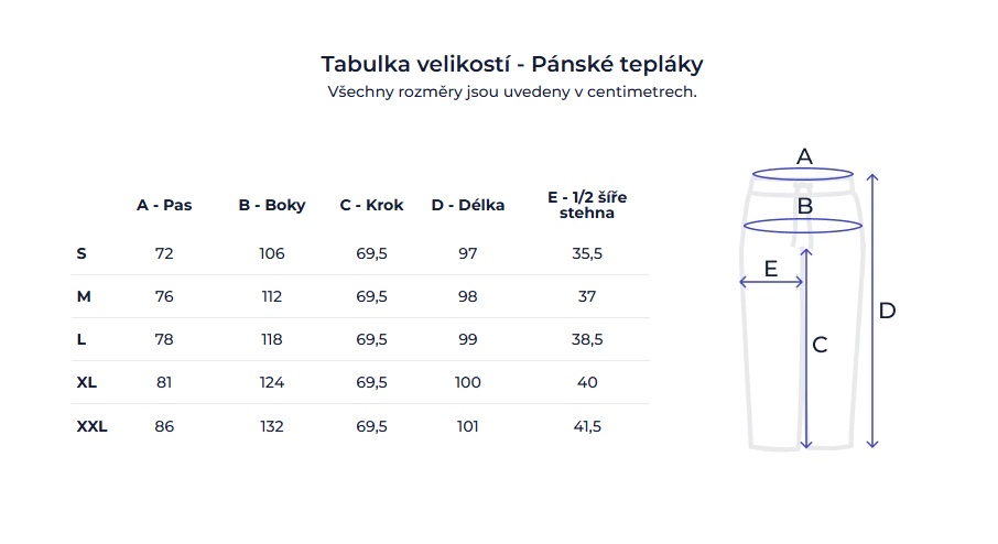 Pánské tepláky A = pas • B = boky • C = krok • D = délka • E = 1/2 šíře stehna