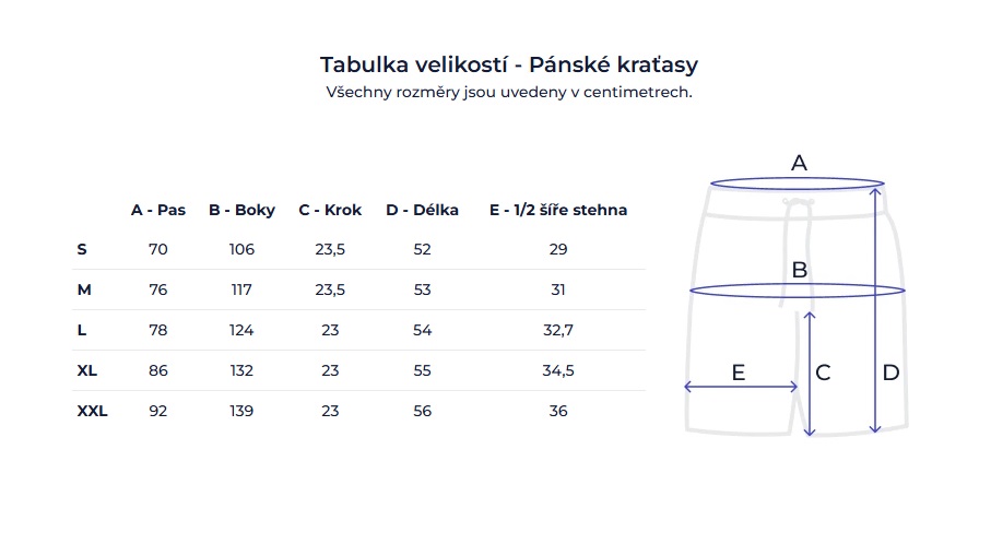 Pánské kraťasy A = pas • B = boky • C = krok • D = délka • E = 1/2 šíře stehna